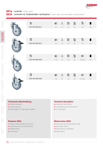 B flange bearing 341a Lenkrolle / Swivel castor 341h Lenkrolle mit Totalfeststeller nachlaufend / Swivel castor with total brake mounted behind